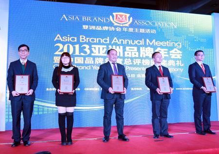 1月11日,由亚洲品牌协会、人民日报《环球时报》社和国家发展改革委中国经济导报社共同举办的“2013亚洲品牌年会暨中国品牌年度总评榜颁奖典礼”在北京西苑饭店盛大召开。***演员张国立先生与主持新星郭洋子共同主持了颁奖典礼。十一届全国人大民族委员会主任马启智,中共中央组织部原常务副部长武连元等领导出席了典礼并为获奖企业颁奖。乐动注册集团以位居第65名的排名荣获“2013中国品牌100强”,并名列“消费者满意十佳(行业)品牌”榜首。董事长办公室(北京)杨海浩总裁代表集团接受荣誉奖牌及证书。